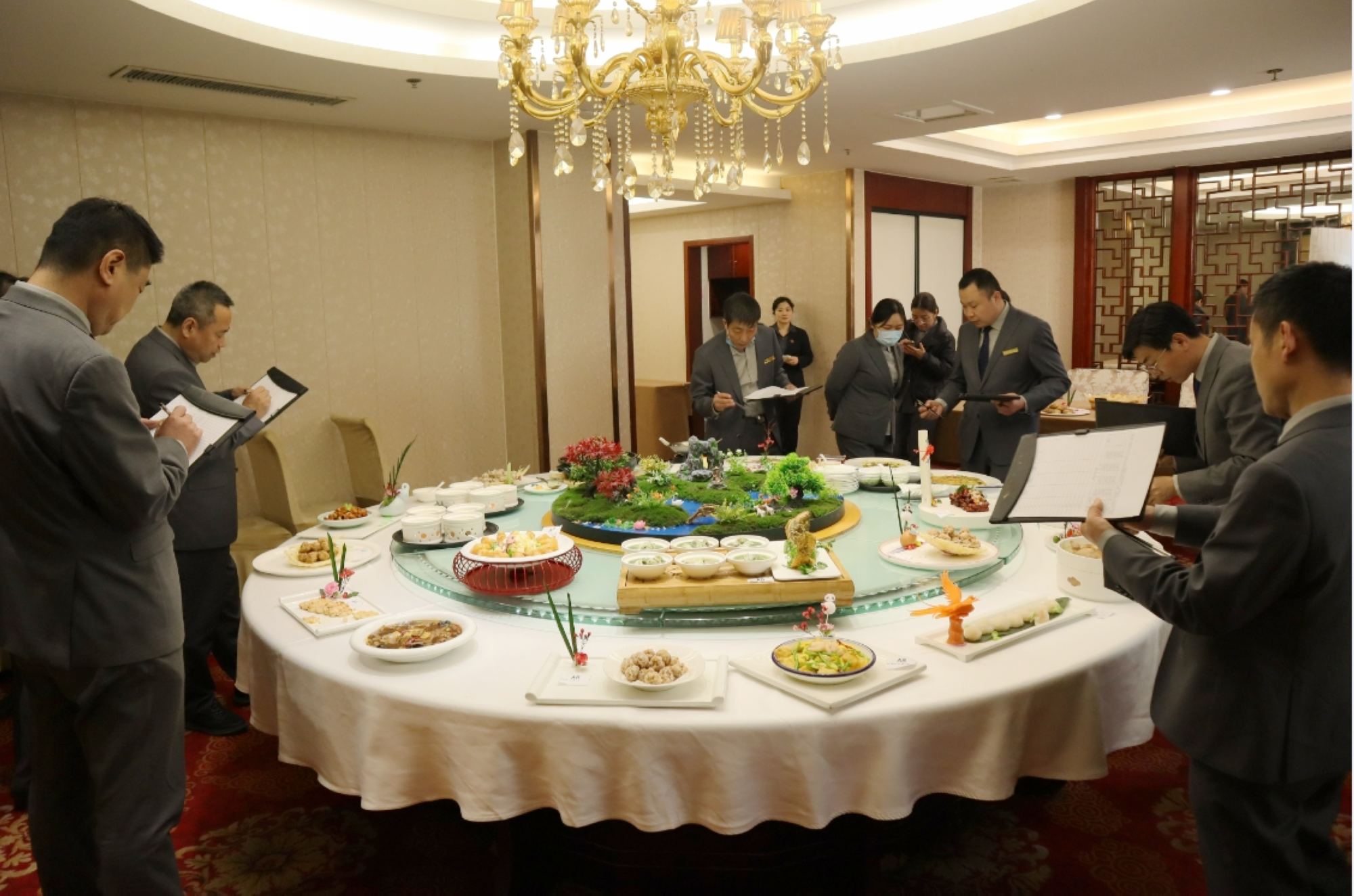 復評現場(chǎng),大廚們亮出絕活,烹飪技術(shù)爐火純青,盤(pán)飾雕刻栩栩如生。經(jīng)過(guò)精心烹飪、調味、裝飾、擺盤(pán),一道道精致菜品完美呈現在評委小組面前。評委小組對每位大廚的烹飪技術(shù)、菜品呈現進(jìn)行評判、打分,對復評結果進(jìn)行總結。